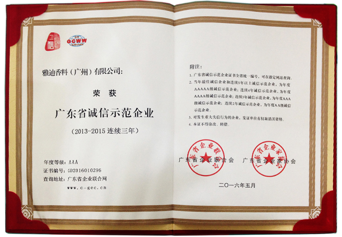东升国际官网香料(广州)有限公司一连三年荣获“广东省诚信树模企业”声誉称呼,,,,,,,,为年度AAA级诚信树模企业,,,,,,,,由广东省企业团结会和广东省企业家协会揭晓。。。。。。