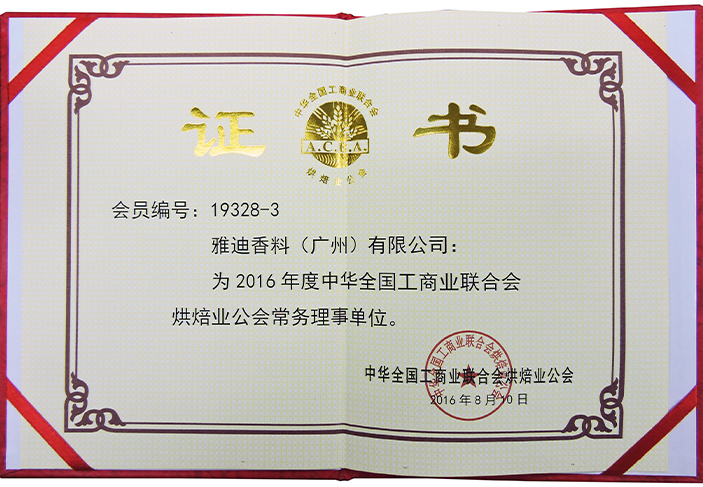 东升国际官网香料(广州)有限公司为2016年度中华天下工商业团结会烘焙业公会常务理事单位。。。。。。